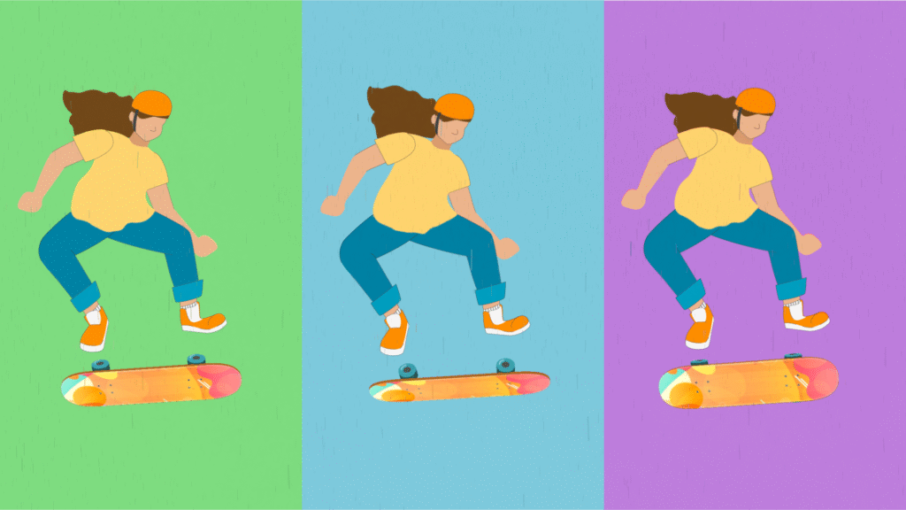 EN – The character embodies the youth and strength of Brazilian skateboarding, with a simple and expressive design that ensures clear and quick readability. Animated through rigging, she combines vibrant colors inspired by skate culture.